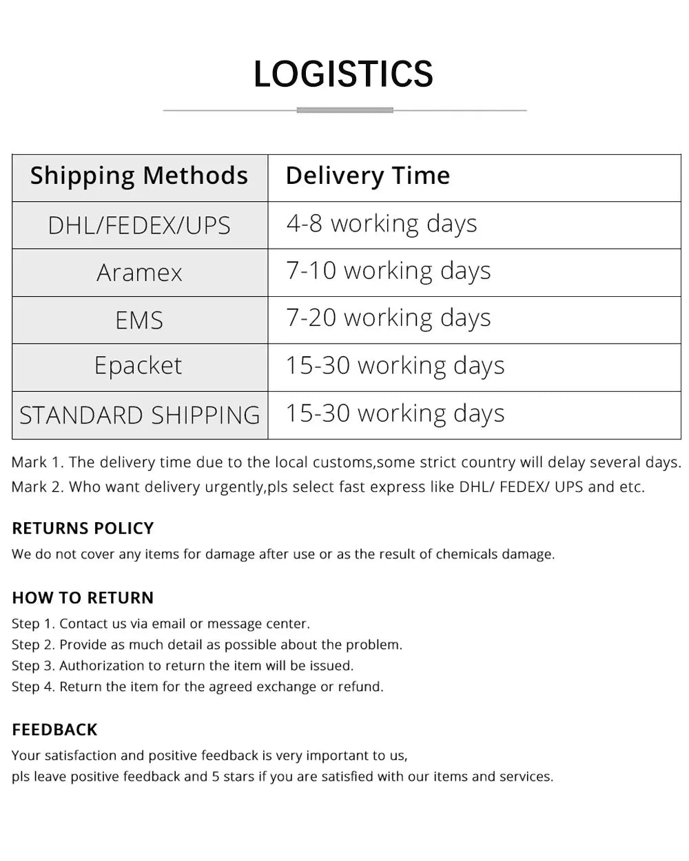 • Standard shipping: 5-7 business days